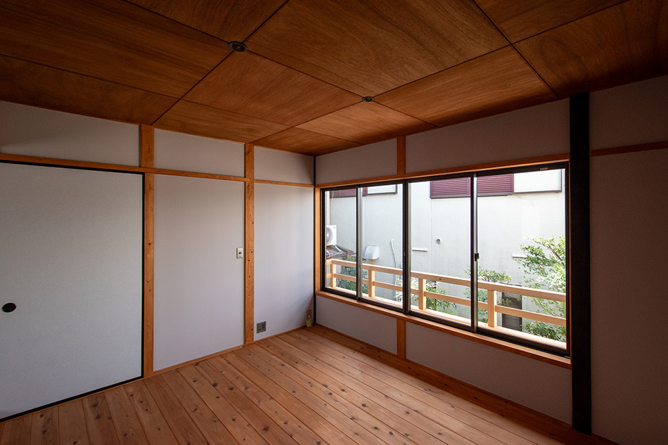 階段を上った2階は、畳敷きや柿渋塗の床など、質感ある素材使いが心地よい空間。